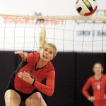 Leanne Stennett slams home a shot in the first set as the 14th-ranked Southern Oregon volleyball team scored a 25-23, 25-21, 25-13 victory over Holy…
