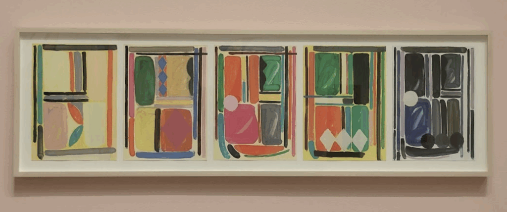 Many of the pieces contain the same geometric concepts and colors, just rearranged. This similarity creates a visual language for the viewer, allowing them to ponder and discuss the meaning behind each painting and what it might be saying.